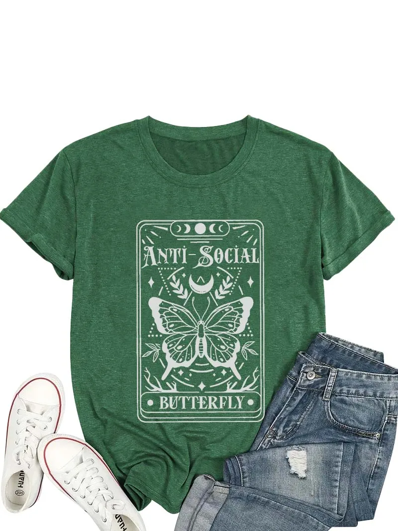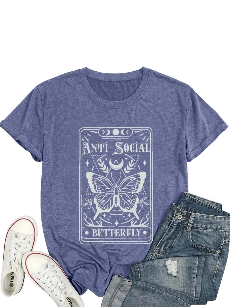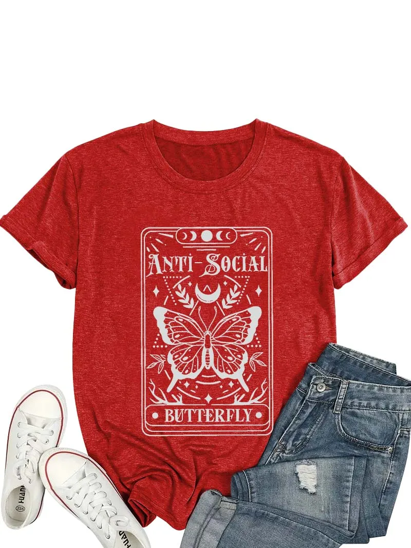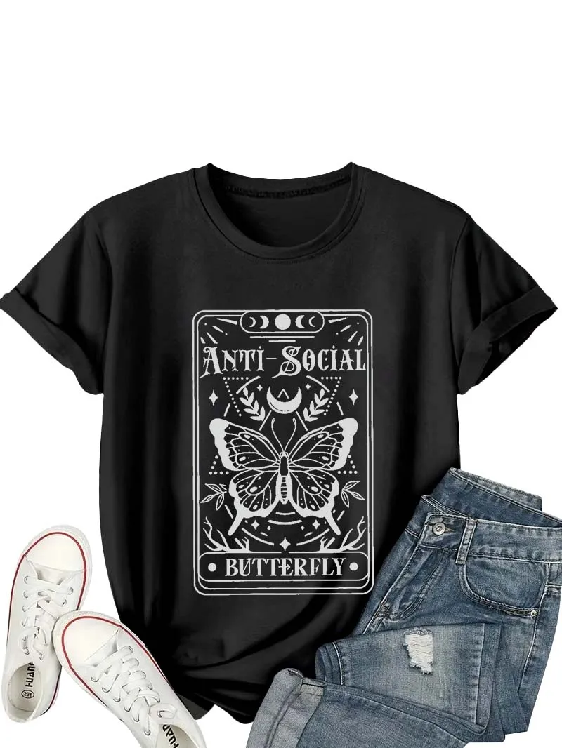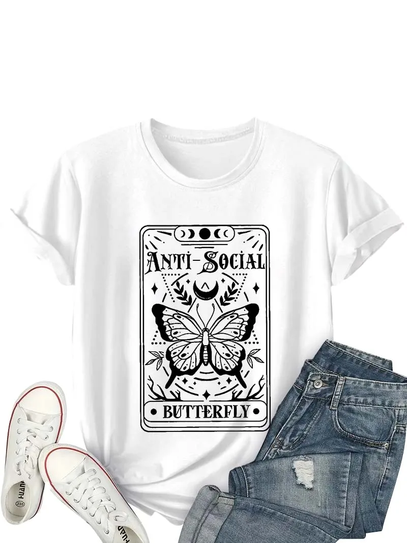 Plus size Women's White Graphic Tee with "Anti Social Butterfly" Tarot inspired Print for Alternative Events and Edgy Casual